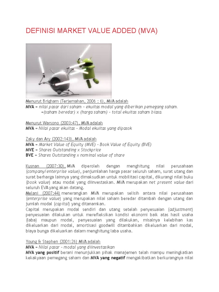 Value added is the sales price of a product minus its direct production costs. Sedangkan market value added (mva) adalah perbedaan antara nilai pasar ekuitas perusahaan pada periode tertentu dengan nilai ekuitas yang dipasok para investornya. These metrics are useful for business owners because they highlight whether the firm is doing well or performing poorly. Market value added (mva) is the difference between the current market value of a firm and the capital contributed by investors.